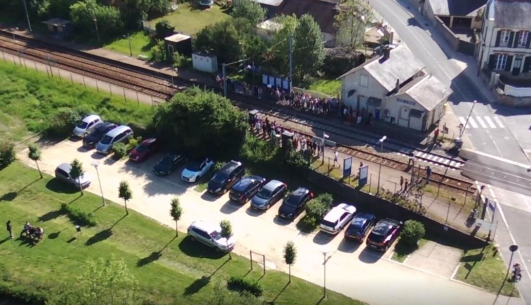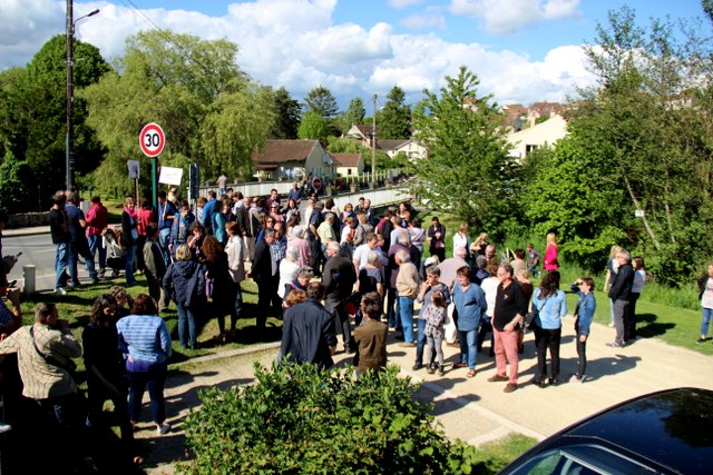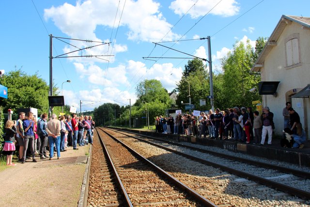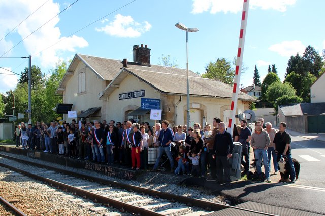 Ce samedi 20 mai 2017, A l'appel de l'association "Voies et Voix en Vexin" et du collectif "J'aime ma gare", plus de 100 personnes, élus, riverains et usagers, se sont réunies à la gare de Santeuil pour protester contre le projet de la SNCF de supprimer 5 "petites" gares de la ligne J: