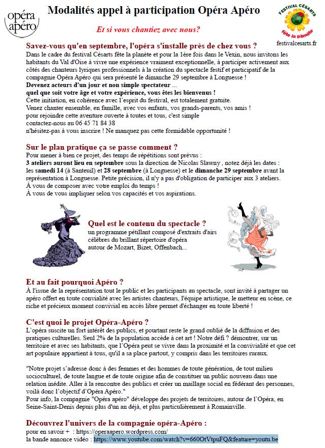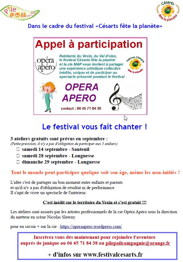 Dans le cadre du festival «Césarts fête la planète», les habitants du VEXIN et du VAL d'OISE sont invités à partager une expérience artistiques, collective, inédite, unique et de participer au spectacle pendant du festival.