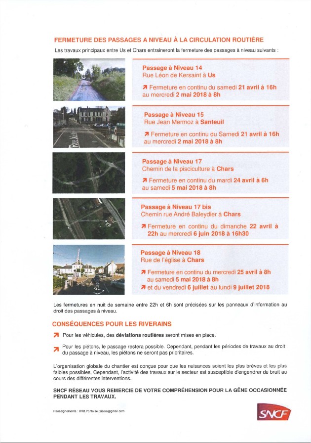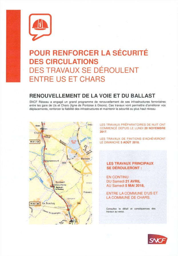 SNCF Réseau a engagé un grand programme de renouvellement de ses infrastructures ferroviaires entre les gare de Us et Chars (ligne de Pontoise à Gisors). Ces travaux vont permettre d'améliorer vos déplacements, renforcer la fiabilité des nfrastructures et maintenir la sécurité au plus haut niveau.