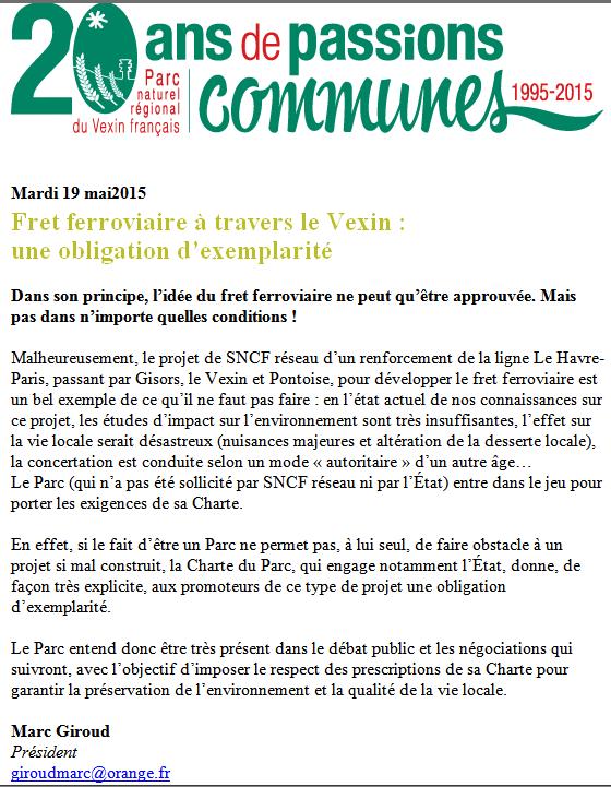 Edito du Président du PARC NATUREL REGIONAL DU VEXIN FRANCAIS, Monsieur Marc GIROUD, le 19 mai 2015: