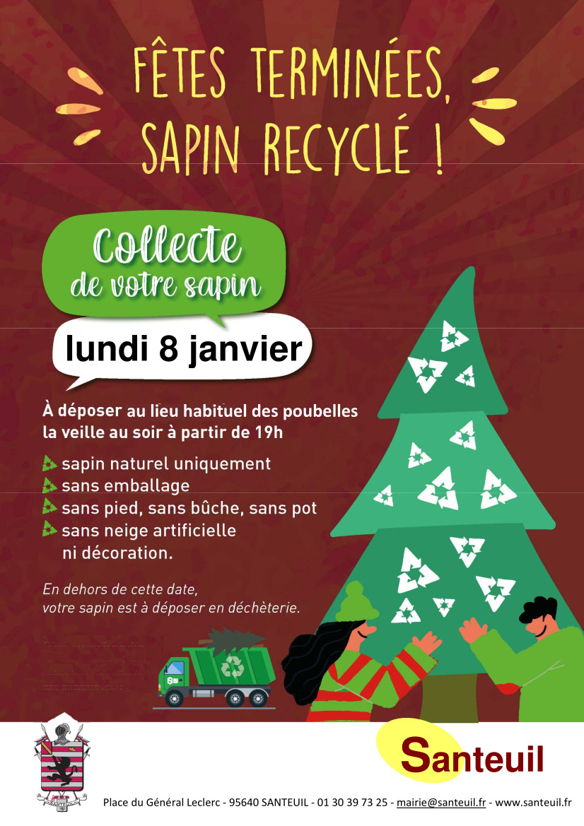 Néanmoins, la municipalité vous propose une collecte spéciale de vos sapins le lundi 8 janvier 2024. Pour les personnes souhaitant utiliser ce service exceptionnel, nous vous remercions de bien vouloir sortir votre sapin (naturel) à l’endroit habituel de ramassage des poubelles le dimanche 7 janvier au soir ; destiné à être broyé (et non brûlé), soyez attentifs à ôter toute décoration.