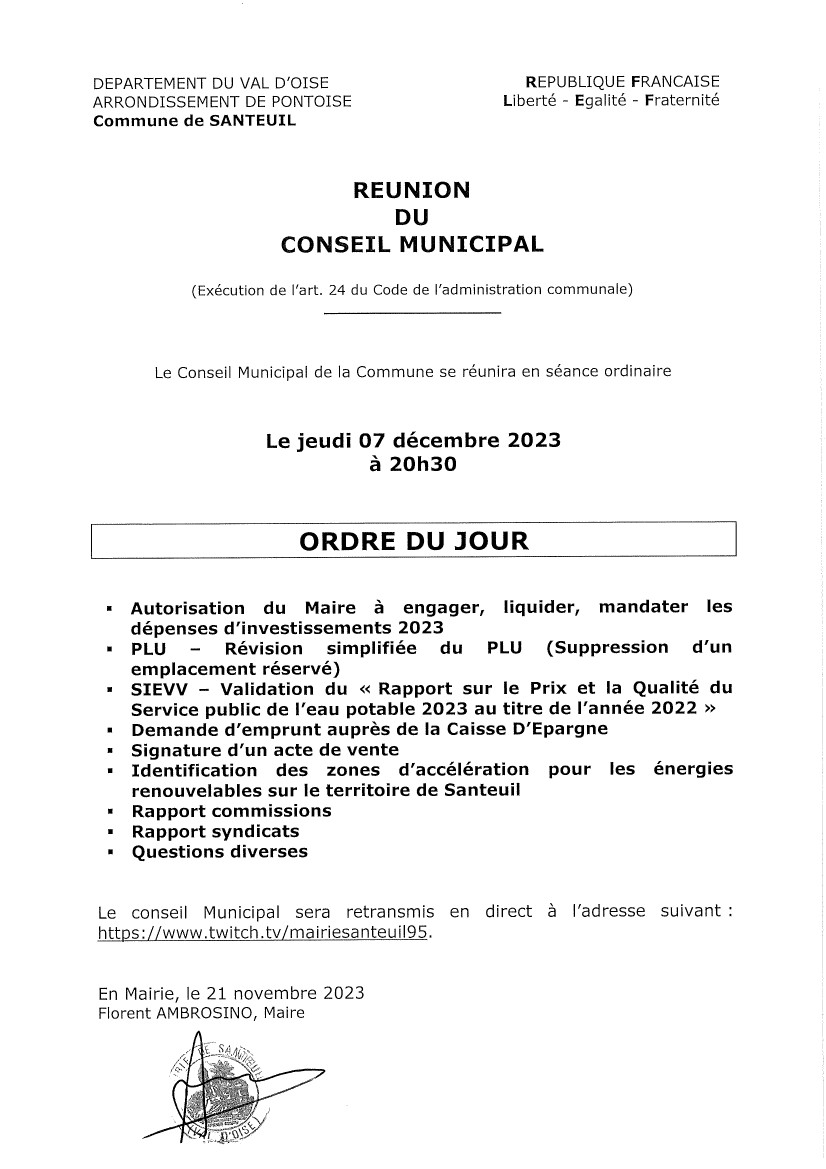 Le Conseil Municipal sera retransmis en direct à l'adresse suivante : https://www.twitch.tv/mairiesanteuil95.